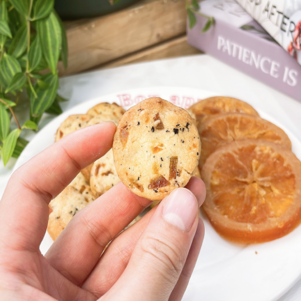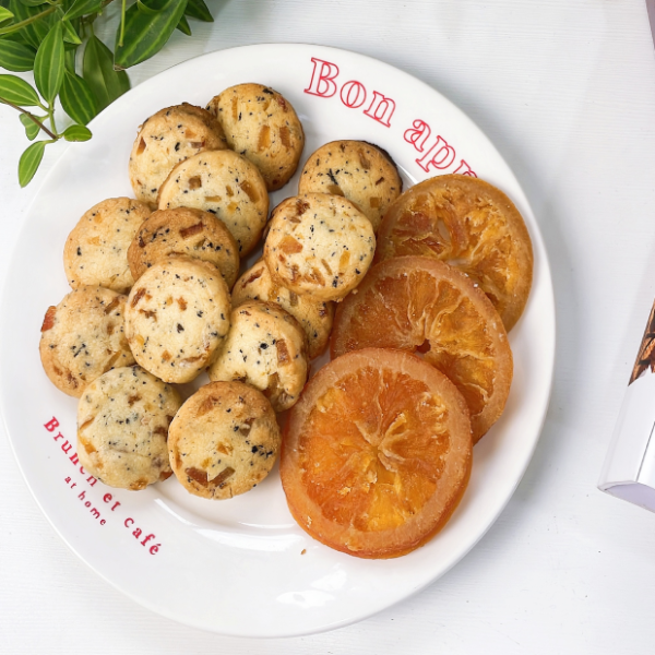 Những chiếc bánh quy bơ thơm hương trà bá tước, kết hợp cùng vị cam dẻo chua ngọt nhẹ rất đưa miệng.