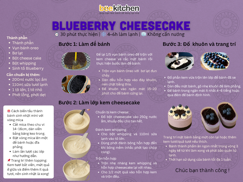 TẶNG KÈM: tờ hướng dẫn chi tiết và mã QR video hướng dẫn cách làm bánh cheesecake việt quất.