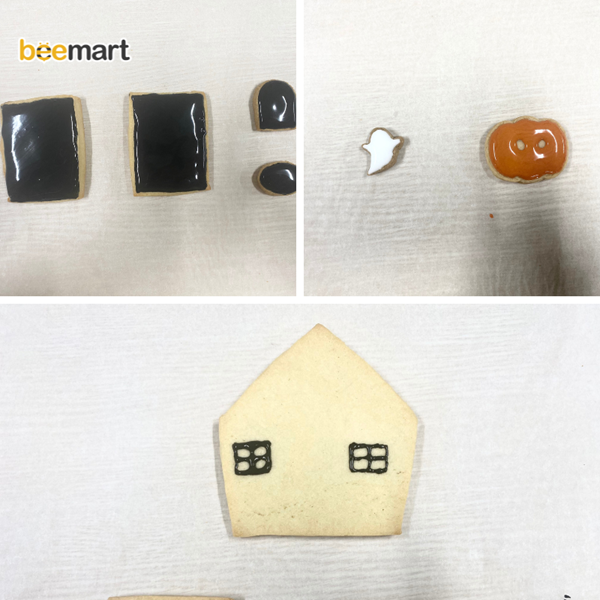 - Tô icing lần lượt các phần mái nhà, cửa, biển hiệu, sửa sổ, bí ngô, con ma