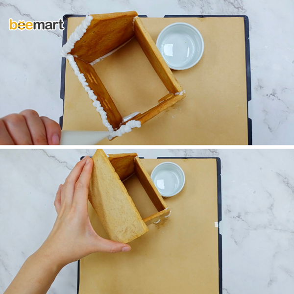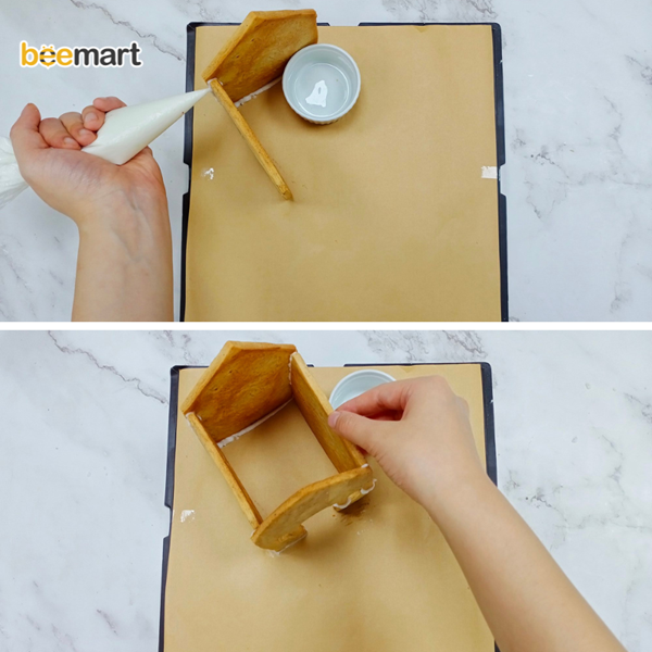 - Sử dụng phần cốt icing để gắn lần lượt các phần thân của ngôi nhà (không bóp icing vào chân ngôi nhà)