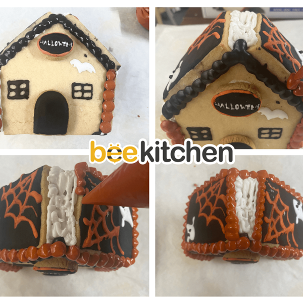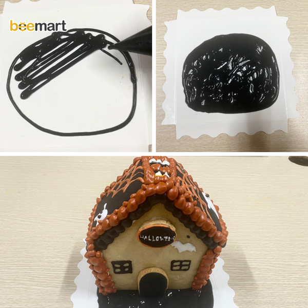 - Vẽ icing trang trí thêm hình con dơi bằng icing trắng trên phần mặt trước của nhà