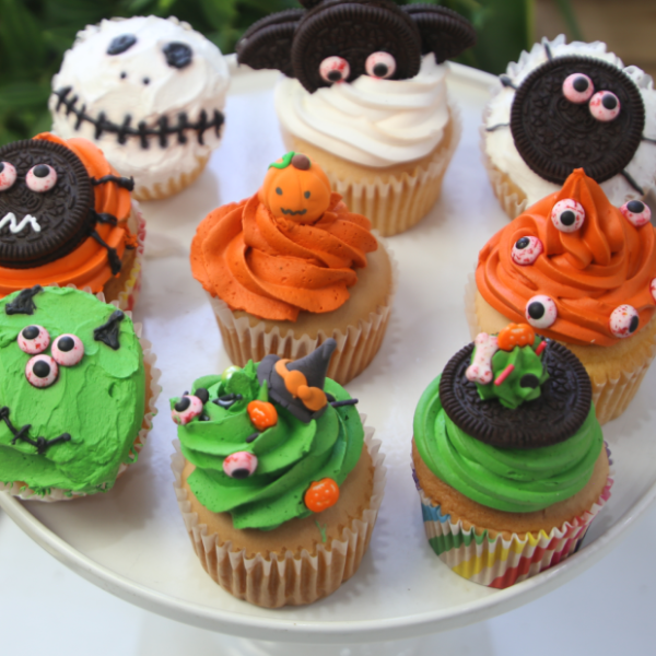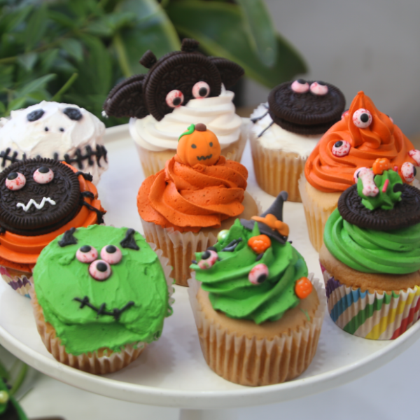 Cupcake halloween với cốt bánh thơm hương vani mềm ẩm, kết hợp cùng lớp kem béo ngậy ngọt nhẹ màu sắc và hình trang trí "ma quái" độc lạ chắc chắn sẽ không thể thiếu trong món tráng miệng của ngày Halloween.