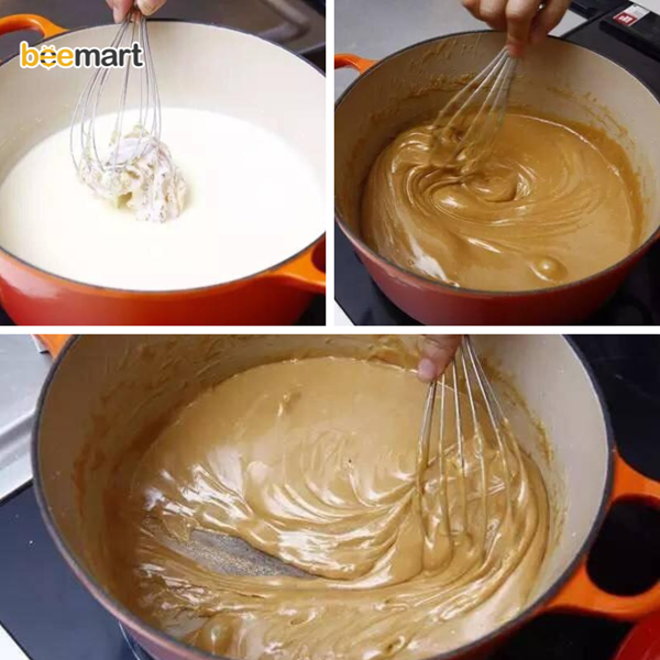- Sau đó đảo đều tay liên tục trong khoảng 30-40 phút trên bếp cho đến khi hỗn hợp đặc lại và chuyển sang màu nâu nhạt.