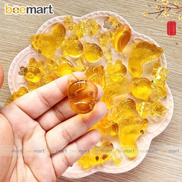 Thành phần: gelatine, đường kính, mật ngô, siro và sinh tố vị ngẫu nhiên