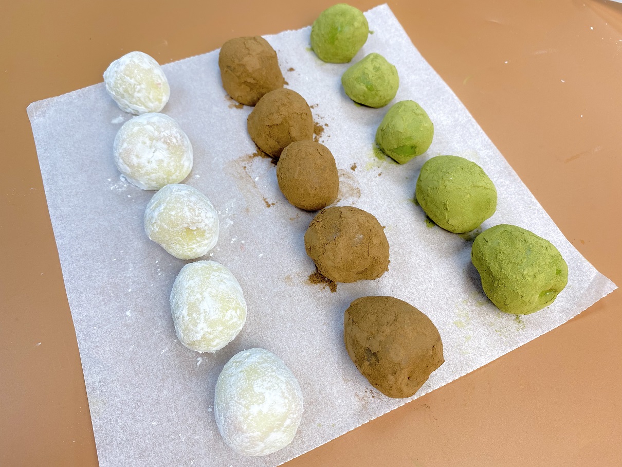 Thành phần: 150g marshmallow, 60g bột sữa nguyên kem, 50g Dâu tây sấy lạnh, 5g Bột cacao, 5g Bột trà xanh, 5g Bột bánh dẻo bắc, 2 tờ giấy nến, 20 tờ giấy gạo, 20 Giấy bạc bọc