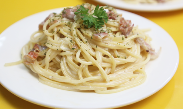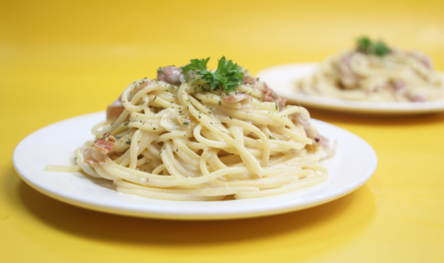 Thành phần: 200g mì spaghetti, 200g whipping cream, 200g sữa tươi, 200g bacon, 100g hành tây, 10g tỏi, muối, tiêu, đường