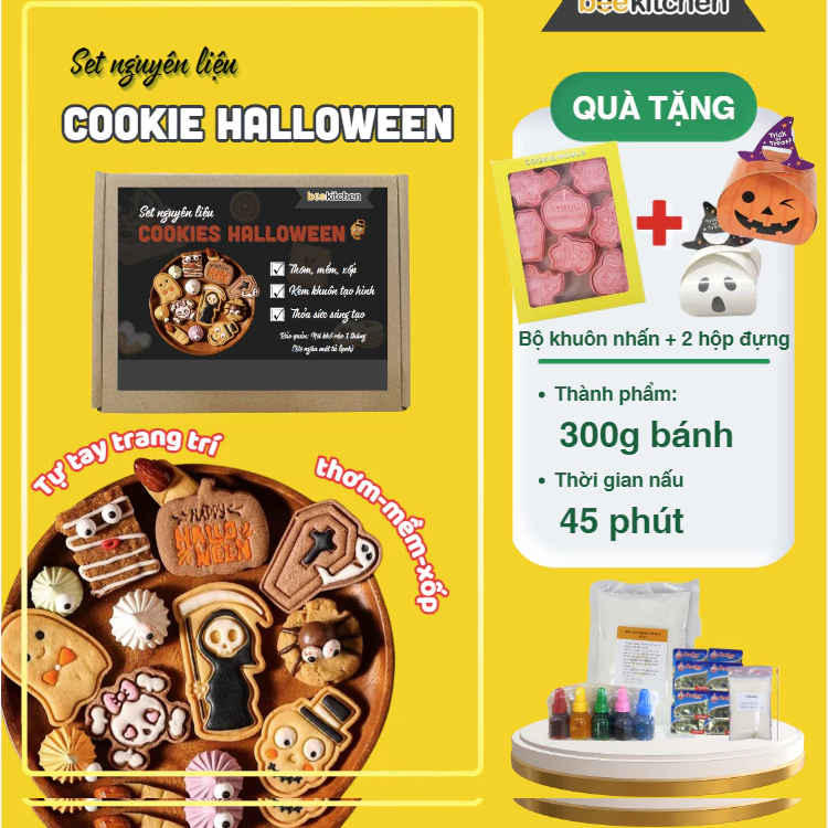 Set Cookie icing Halloween bao gồm: Bột mì đa dụng, Bơ lạt, Đường xay, Đường bột icings, Bột lòng trắng trứng, Set 5 màu thực phẩm, Bộ khuôn 8 hình chủ đề halloween, giấy nến, túi bắt kem, túi trong dán mép, 2 hộp đựng bánh.