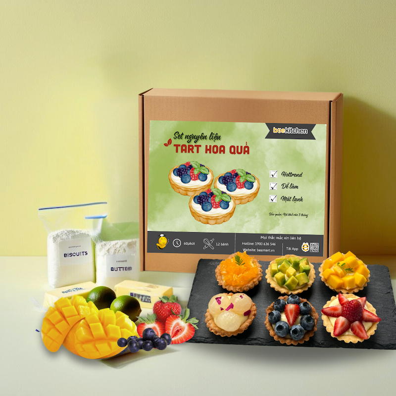 - Thành phần: Bột mì, bơ, đường, bột custard, bột whipping, đế khuôn bạc, hoa quả tươi và trứng (khách tự chuẩn bị)