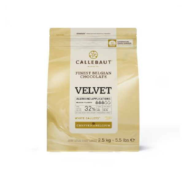 Với 32% cacao, socola trắng Velvet Callebaut có vị đắng nhẹ, nổi bật là vị béo ngậy, ngọt ngào của hương vani và kem sữa, có thể ăn trực tiếp, tuy nhiên sản phẩm thường được ứng dụng để làm nama chocolate, socola bark hay các loại bánh socola, dùng để trang trí bánh kẹo,...