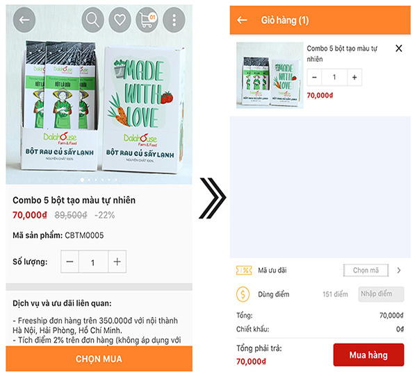 3. Sau khi cho các sản phẩm vào mục "Giỏ hàng", click nút MUA HÀNG.