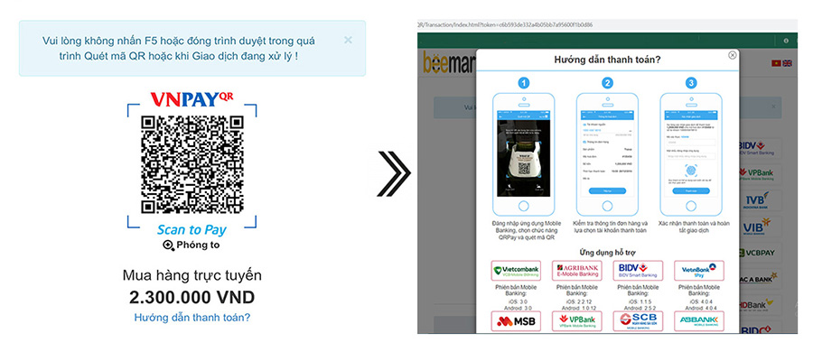 Trong trường hợp đang mua sắm trên máy tính thì người dùng cần phải quét QRCODE bằng ứng dụng Ngân hàng để thanh toán như bên dưới: