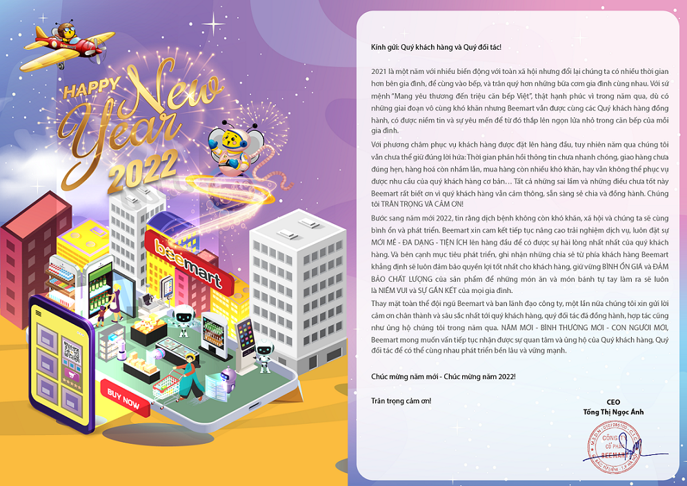 Thay mặt toàn thể đội ngũ Beemart và ban lãnh đạo công ty, một lần nữa chúng tôi xin gửi lời cảm ơn chân thành và sâu sắc nhất tới quý khách hàng, quý đối tác đã đồng hành, hợp tác cũng như ủng hộ chúng tôi trong năm qua. NĂM MỚI - BÌNH THƯỜNG MỚI - CON NGƯỜI MỚI, Beemart mong muốn vấn tiếp tục nhận được sự quan tâm và ủng hộ của Quý khách hàng, Quý đối tác để có thể cùng nhau phát triển bền lâu và vững mạnh.