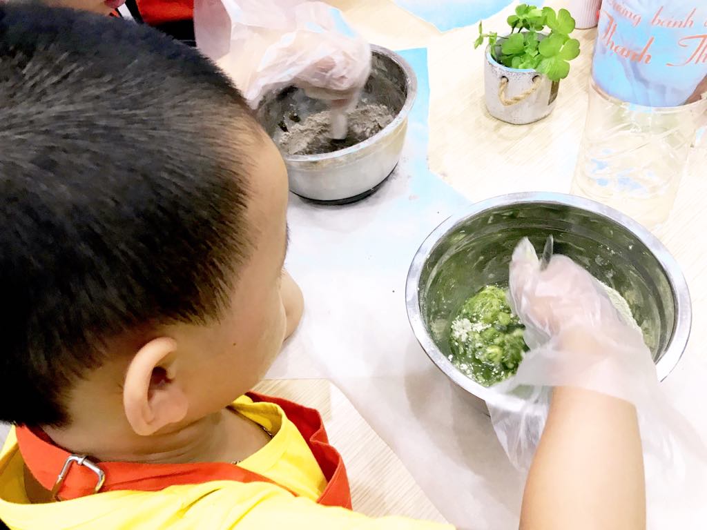 Bạn Bi chăm chú trộn màu cho bột ^^