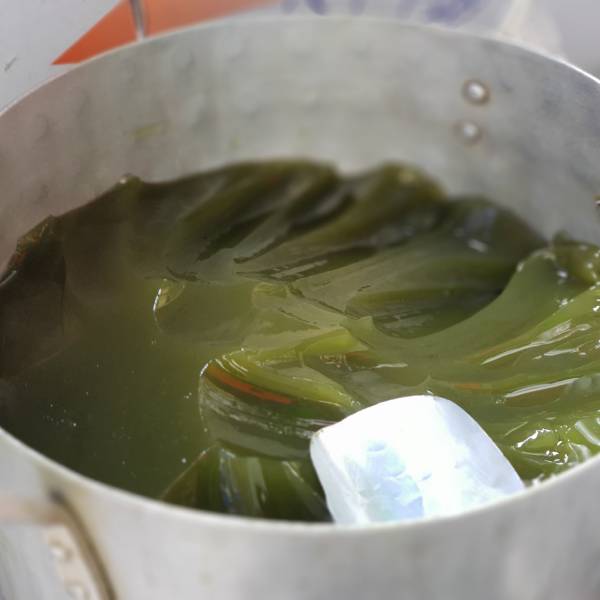 - Sau đó, bạn đổ hết chỗ nước còn lại vào nồi, rồi thực hiện công đoạn vò tương tự như lúc này, mục đích là để lọc lấy chất thạch còn lại ở trong lá găng. Vò đến khi nước chuyển sang màu xanh đen là dừng lại.