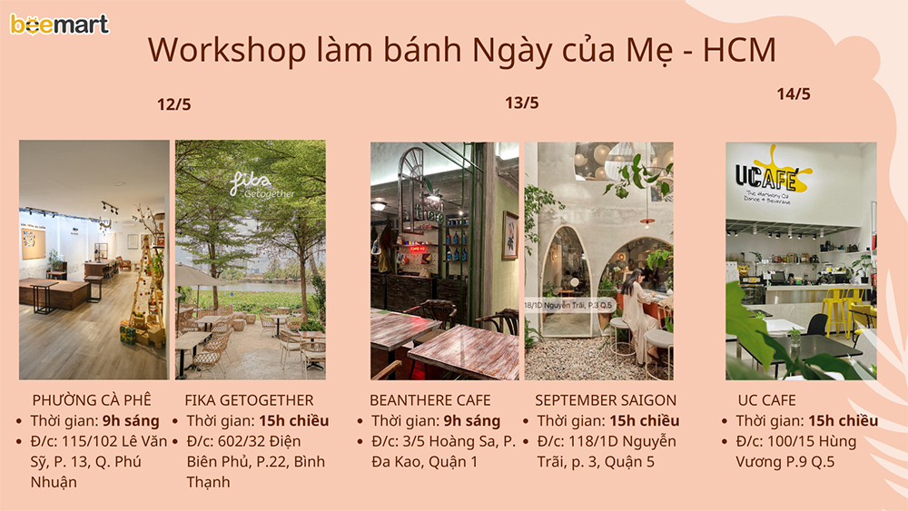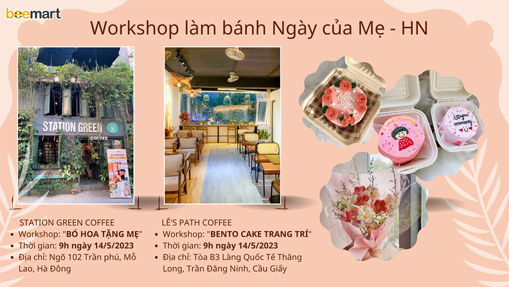Để kỷ niệm ngày của mẹ, nhiều kế hoạch, hoạt động ý nghĩa đã được lên ý tưởng và thực hiện, một trong số đó là cùng mẹ tham gia các buổi workshop làm bánh. Hoạt động làm bánh cùng mẹ tại các buổi workshop có thể giúp chúng ta dành thời gian nhiều hơn cùng mẹ, gần gũi với mẹ hơn và tạo nên nhiều kỷ niệm cùng mẹ vào dịp đặc biệt trong năm dành cho người phụ nữ vĩ đại của chúng ta. Hiểu được mong muốn và nhu cầu của bạn, chúng mình đã kết hợp với các quán cà phê chill nhất và gần bạn nhất cùng tổ chức các buổi workshop làm bánh hấp dẫn nhân ngày của mẹ vào cuối tuần này. Cùng Bee tìm hiểu thêm thông tin và lựa chọn địa điểm bạn yêu thích nhất nhé!