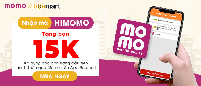 Khi chọn hình thức thanh toán qua MOMO lần đầu tiên, đừng quên nhập mã ưu đãi "HIMOMO" để giảm ngay 15k nha. Vừa tiện, lại có quà bất ngờ