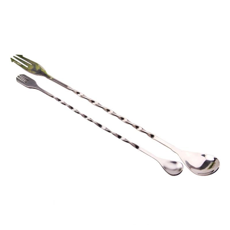 Được làm bằng chất liệu thép không gỉ, thìa có một đầu có dạng muỗng café dùng khuấy cocktail, đầu kia có dạng hình dĩa để có thể tận dụng dầm các loại trái cây trong khi pha chế.