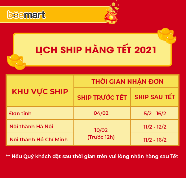 - Beemart ngừng nhận đơn tỉnh sau ngày 04/2/2021 (tức 23/12 âm lịch). Để đảm bảo nhận được hàng trước Tết âm lịch, Quý khách vui lòng đặt hàng trước ngày 04/2/2021.