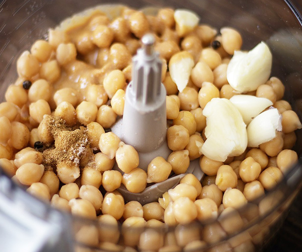 4. Vớt đậu ra để ráo, bây giờ bạn đang có khoảng 3 chén đậu chín, bạn tiếp tục cho vào cối xay thực phẩm xay đều cho đến khi được hỗn hợp bột đậu cứng (có thể vo viên được), thêm bơ mè, nước cốt chanh, tỏi, và 1/2 thìa cà phê muối. Cuối cùng, từ từ nhỏ nước đá vào vừa tiếp tục trộn đều trong khoảng 5 phút, cho đến khi bạn có được một hỗn hợp sốt bông và mịn.
