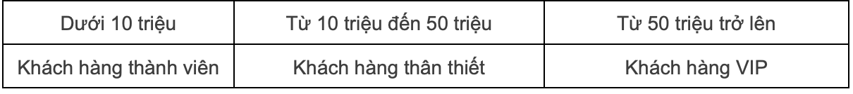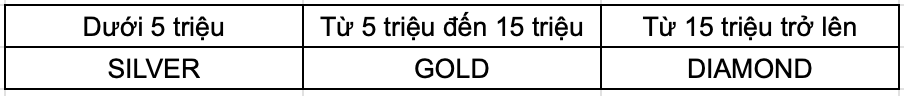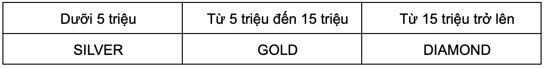 - Hạng DIAMOND được áp dụng đối với khách hàng có tổng chi tiêu từ 15 triệu trở lên.