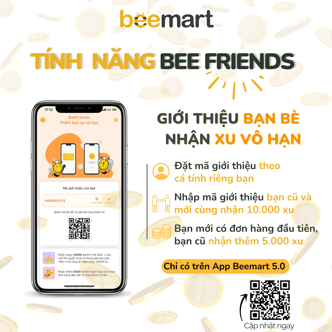 Với phiên bản App Beemart 5.0, Bee mới ra mắt tính năng BeeFriends - giới thiệu bạn bè sử dụng App Beemart. Với tính năng này, bạn sẽ nhận tới 15.000 xu với mỗi người mà bạn giới thiệu sử dụng App Beemart. Cụ thể: