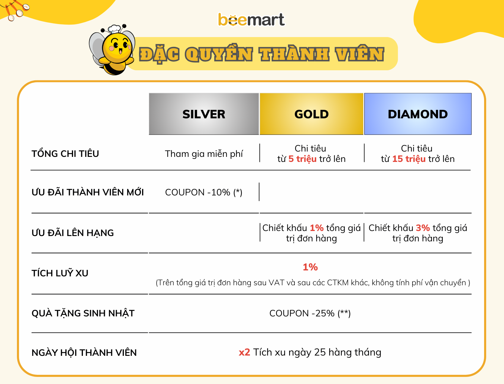 - Hạng thành viên là cấp bậc mà thành viên được công nhận dựa vào số tổng chi tiêu cho Beemart trong 1 năm tính từ 1/1/2025 và hết hạn vào 31/12 hàng năm.