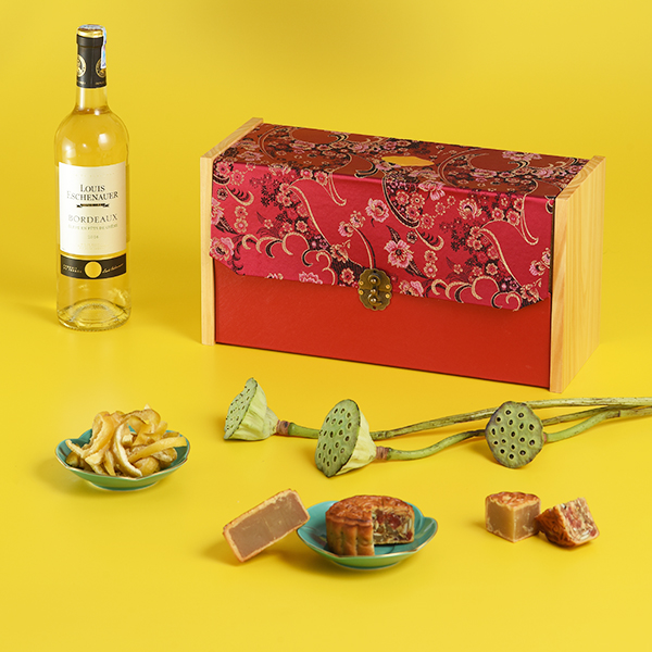 - Bao gồm 1 bánh thập cẩm truyền thống, 1 bánh sen Huế (100gr/hộp); 1 mứt bưởi sấy dẻo (150gr/hộp), 1 chai rượu vang trắng Louis Eschauneur 750ml.