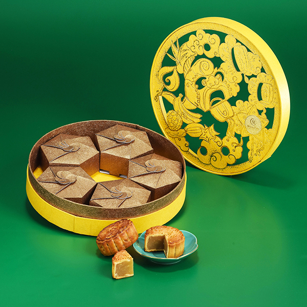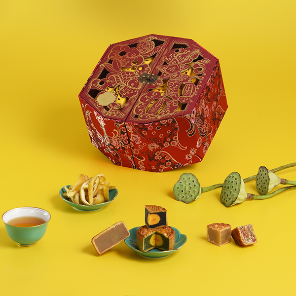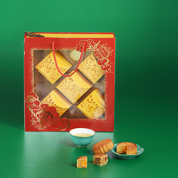 Hộp bánh bao gồm 1 bánh thập cẩm truyền thống, 1 bánh sen bắc, 1 bánh đậu xanh trứng muối (trọng lượng: 100g/hộp); 1 mứt bưởi sấy dẻo (150gr/hộp) và 1 trà xanh hương nhài (50gr/hộp)