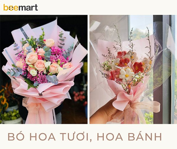Bạn có 2 sự lựa chọn cho món quà này: Bó hoa tươi và bó hoa bánh. Hoa tươi là một món quà đã quá quen thuộc với bạn, mỗi bó dao động từ 300.000đ đến hơn 1 triệu đồng tùy thuộc vào độ chịu chi và loại hoa bạn lựa chọn. Hoa tươi thường được các cặp đôi hoặc đối tượng đứng tuổi một chút lựa chọn vì sự sang trọng và thể hiện được sự yêu mến, tình cảm của bạn dành cho người nhận hoa.