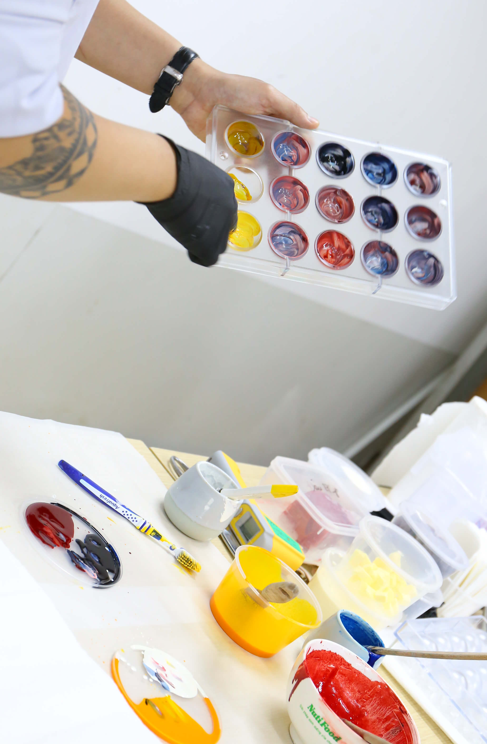 Cách để pha màu gốc dầu là theo tỷ lệ màu và bơ cacao là 1: 10 (ví dụ 5g màu : 50g bơ cacao)
