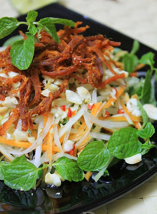 – Bước 5: Cho đu đủ, cà rốt bào sợi, rau thơm thái nhỏ lên đĩa, rưới nước nộm lên sao đó cho thịt bò khô và lạc vào, trộn đều và thưởng thức.