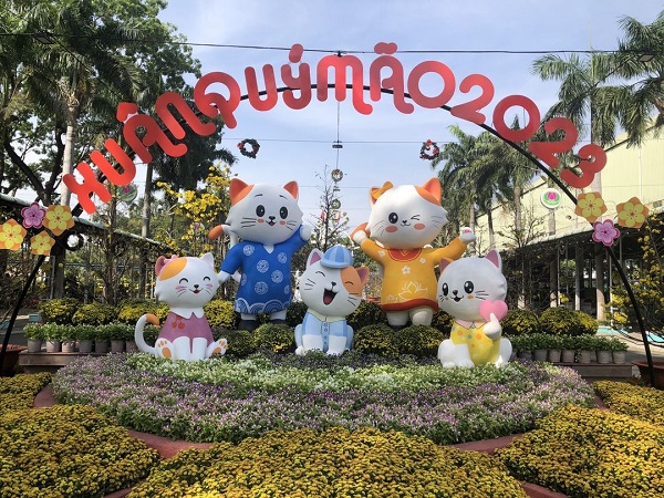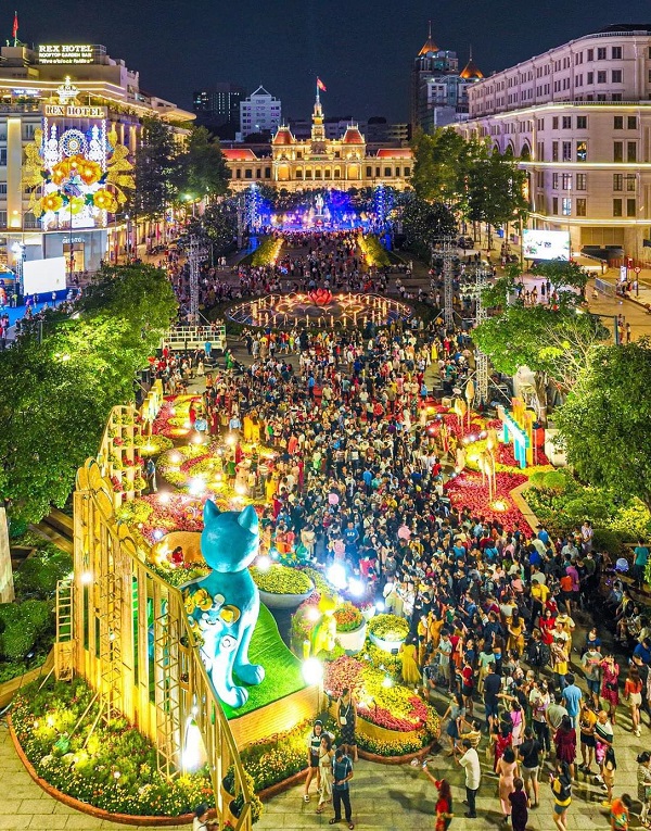 Đã thành thông lệ suốt 20 năm qua, vào dịp Tết cổ truyền, TP HCM sẽ mở cửa đường hoa Nguyễn Huệ để phục vụ du khách đến tham quan và chụp ảnh. Mỗi năm tại đây sẽ là khoác lên mình một tấm áo mới với chủ đề của từng năm, muôn sắc hoa xuân cùng diện mạo ấn tượng. Tại cổng chào Đường hoa Tết 2023, sáu linh vật chào đón du khách có chiều cao từ 0,8-4,5 m, được tạo hình bằng xốp, sơn mỹ thuật bề mặt giả gốm.