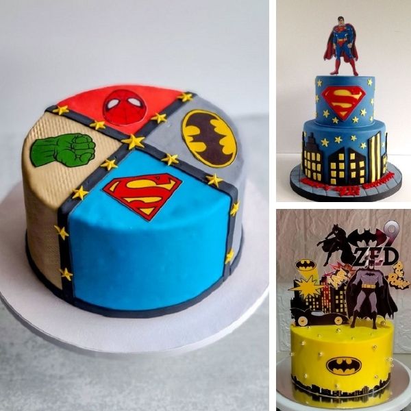 Mẫu bánh sinh nhật tụ hội các siêu anh hùng mà bé trai thích như Batman, Superman, người nhện