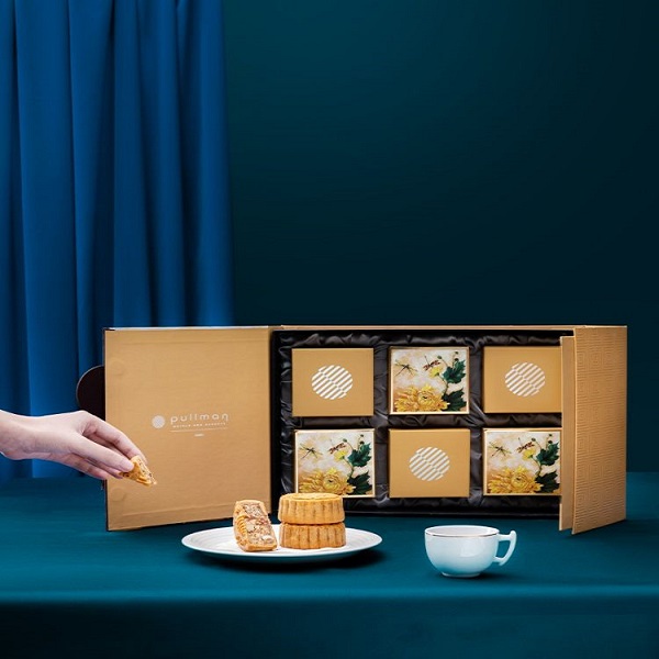 Ngôn ngữ thiết kế hộp bánh trung thu Pullman được lấy cảm hứng từ hoa cúc vàng rực rỡ trong khung cảnh đêm trăng thanh bình, nhân bánh phong phú kết hợp với nguyên liệu truyền thống làm nên vị sen nhuyễn trứng muối, trà xanh trứng muối, lá dứa, hạt ngũ cốc với xúc xích Chorizo, hạt Chia trứng muối, việt quất đậm vị.