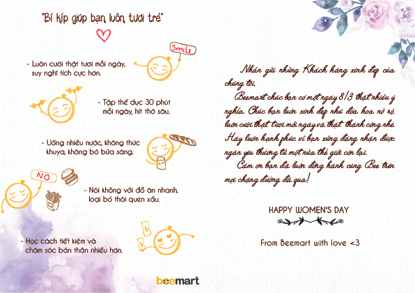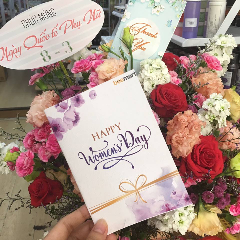 Nhân ngày Quốc tế phụ nữ 8/3/2019, nhắn gửi những Khách hàng xinh đẹp của chúng tôi, Beemart chúc bạn có một ngày 8/3 thật nhiều ý nghĩa. Chúc bạn luôn xinh đẹp như đóa hoa nở rộ, luôn cười thật tươi mỗi ngày và thật thành công nhé. Hãy luôn hạnh phúc vì bạn xứng đáng nhận được ngàn yêu thương từ một nửa thế giới còn lại. Cảm ơn bạn đã luôn đồng hành cùng Bee trên mọi chặng đường đã qua!