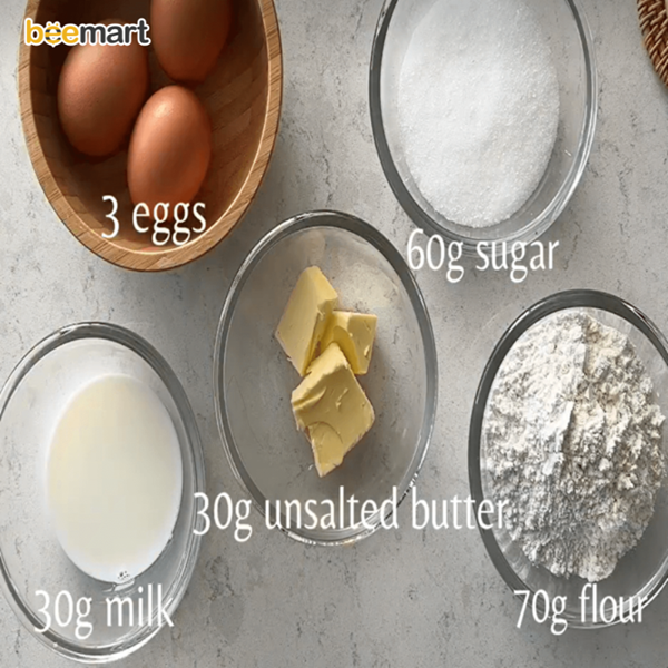 - Chuẩn bị các nguyên liệu để làm phần cốt bông lan bao gồm: 3 quả trứng, 30g sữa tươi, 30g bơ nhạt, 70g bột mì số 8, 60g đường