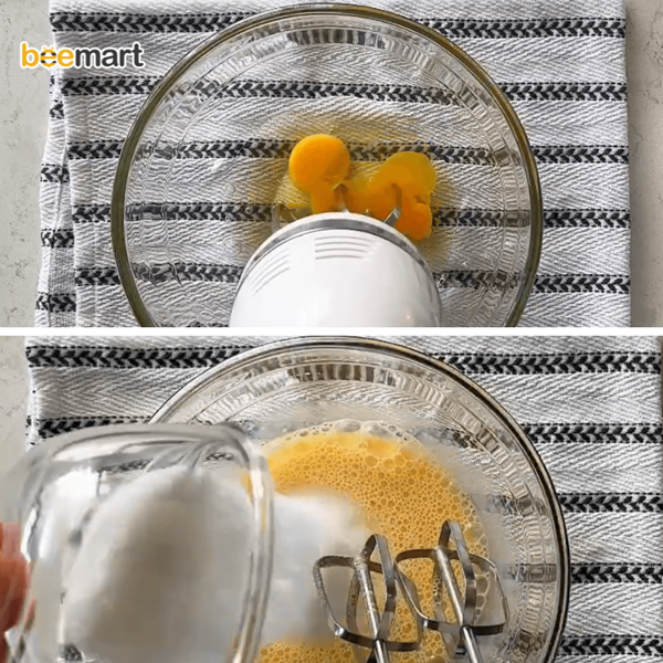 - Thêm 60g đường vào hỗn hợp, tiếp tục đánh đến khi hòa quyện.