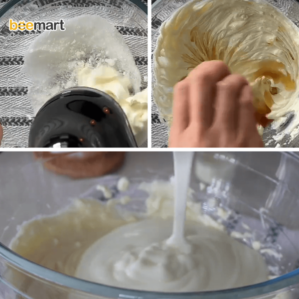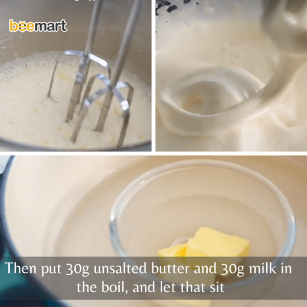 - Đổ hỗn hợp bơ và sữa vào bát trứng và tiếp tục đánh ở tốc độ cao đến khi hỗn hợp tạo vân thì giảm xuống tốc độ thấp, hỗn hợp đặc lại có thể vẽ hình số 8 là đạt