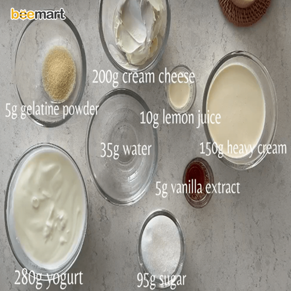 Chuẩn bị các nguyên liệu làm kem phô mai bao gồm: 200g cream cheese, 150g whipping cream, 5g tinh chất vani, 95g đường, 280g sữa chua không đường, 10g nước cốt chanh, 5g bột gelaine, 35g nước