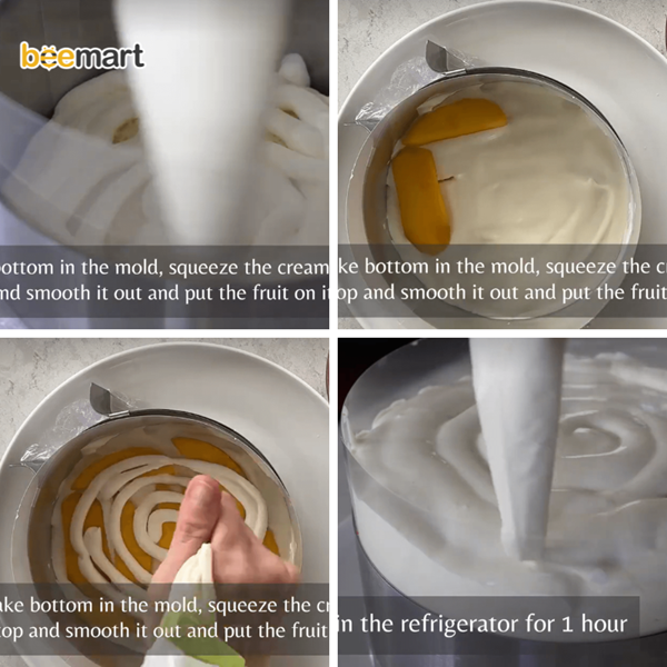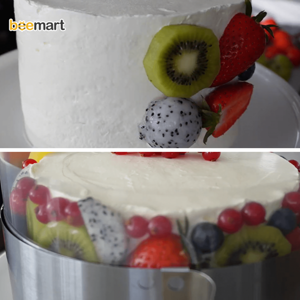 - Sử dụng khuôn mousse khoảng 20cm (nên dùng khuôn thay đổi kích thước) lót mica viền quanh bánh sao cho cách hoa quả 1 khoảng 1cm