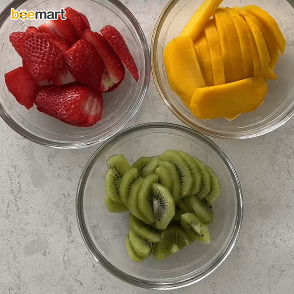 - Tip: Nên chọn nhiều loại quả mix các màu sắc khác nhau như dâu, xoài, kiwi, thanh long, việt quất,...