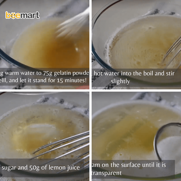 - Cho 75g bột gelatine và 375g nước ấm, khuấy đều và để yên trong 15 phút. Sau đó đổ 750g nước nóng vào và khuấy nhẹ cho hỗn hợp tan.