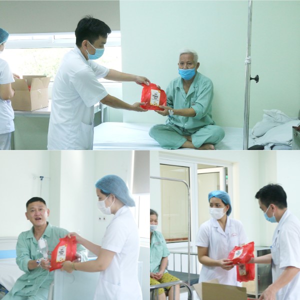 Các y bác sĩ phát quà cho bệnh nhân ở bệnh viên E