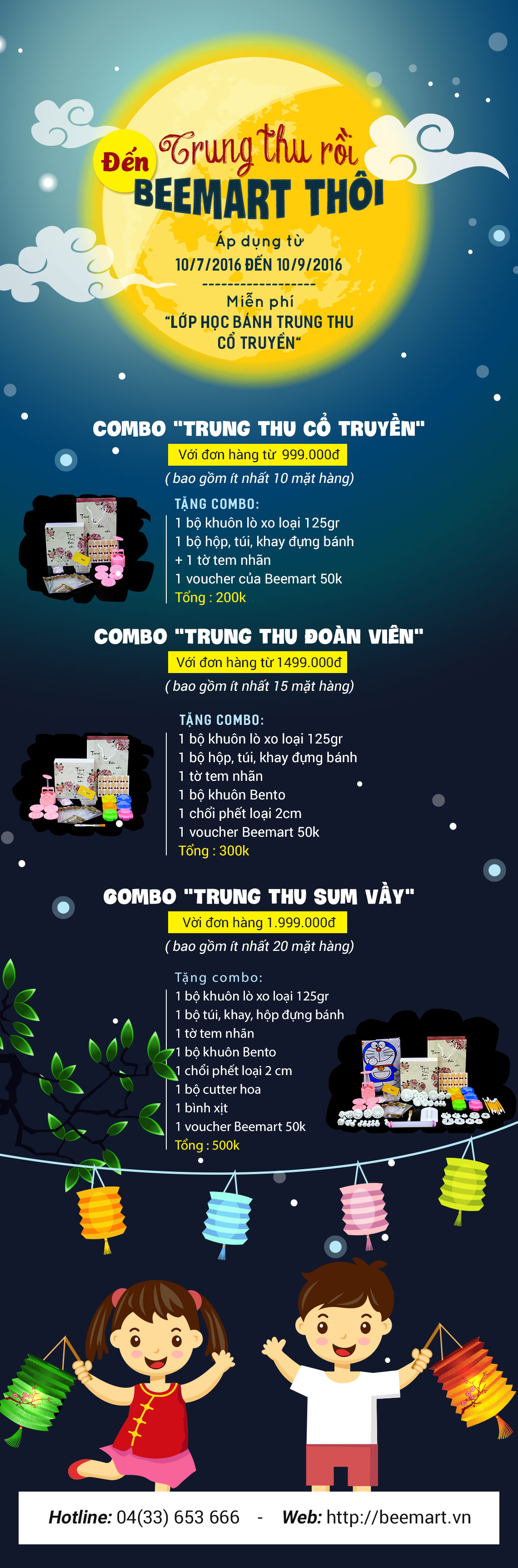 Còn gần 2 tháng nữa mới đến trung thu nhưng nhà nhà, người người đã chuẩn bị cho mùa trung thu 2016 rất tấp nập và rộn ràng rồi. Cùng với đó, để mọi người có thể tự làm những chiếc bánh trung thu đơn giản cho gia đình và người thân, Chương trình "Trung thu rồi đến Beemart thôi " của Beemart - Nơi đến của những người yêu bánh sẽ dành tặng bạn những gói Combo Đồ làm bánh Trung Thu hấp dẫn với trị giá đơn hàng khác nhau.