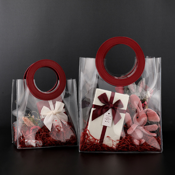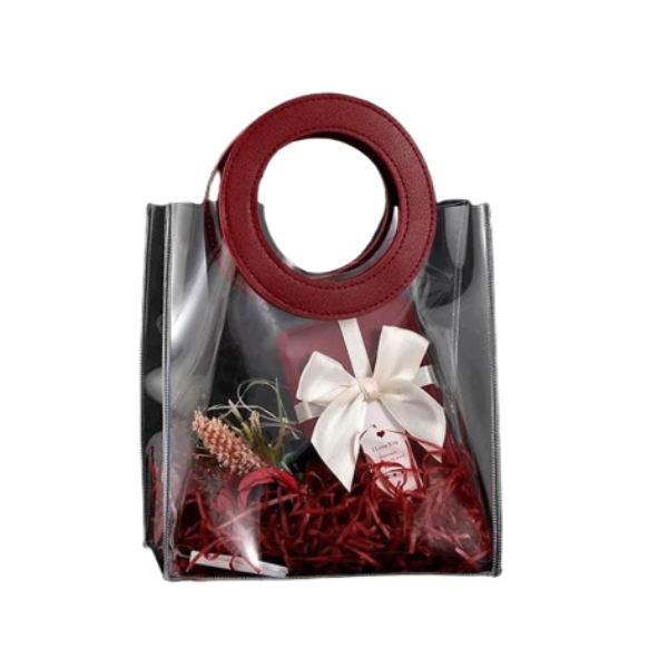 Túi đựng quà có tay cầm màu đỏ chắc chắn, bắt mắt. Bên cạnh đó, sản phẩm là dạng túi nhựa dẻo PVC trong suốt nên có thể dễ dàng quan sát thành phẩm bên trong, tiện lợi hơn trong việc trang trí giỏ quà.