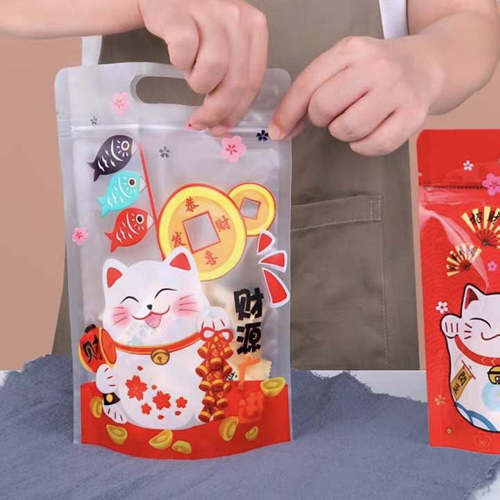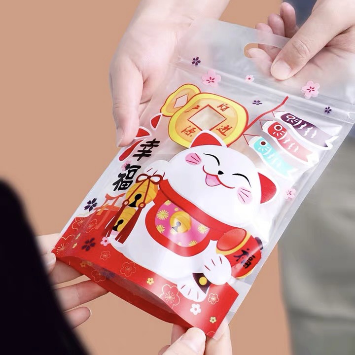 Túi zip đựng bánh kẹo tết có thiết kế hình chú mèo thần tài xinh xắn, bắt mắt rất phù hợp để đem đi biếu tặng hoặc trưng bầy trên ban thờ ngày lễ.