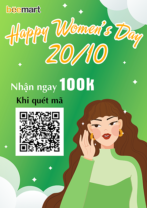 Trong ngày đặc biệt 20/10 - Ngày phụ nữ Việt Nam, tất cả khách hàng khi mua hàng tại Beemart (cả Online và Offline) đều nhận được ngay Voucher 100K cho lần mua hàng tiếp theo.