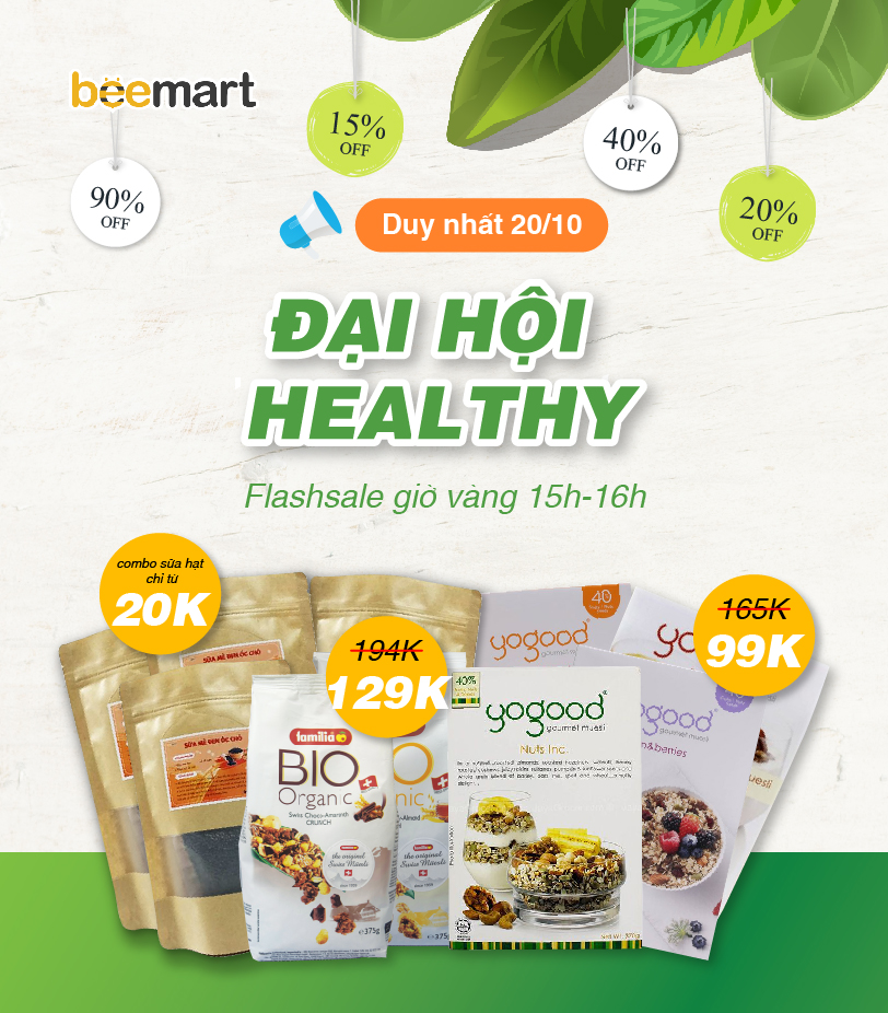 Ngoài tặng Vocuher cho tất cả khách hàng nữ, trong ngày 20/10 Beemart còn có chương trình SALE 20% dòng hàng Healthy với Ngũ cốc, Yến mạch, các dòng Hạt dinh dưỡng và Hạt chế biến cho các chế độ ăn Eatclean, Keto, Lowcarb. Mong giúp cho người phụ nữ có một làn da đẹp, vóc dáng thon và sức khoẻ tốt, bạn hãy cùng Bee trải nghiệm những thực phẩm tốt nhất nhé!