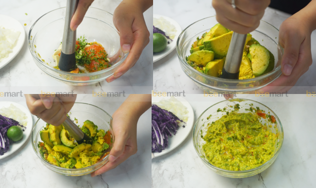 - Thêm vào tô 100g bơ đã cắt miếng, nghiền nhuyễn tất cả các nguyên liệu