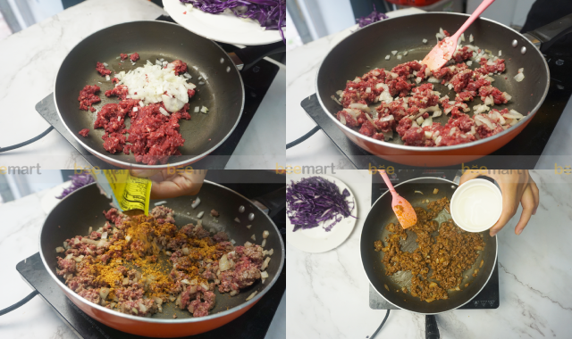 - Thêm 1 chút dầu vào chảo, để bếp ở lửa vừa. Khi dầu nóng thì cho thịt bò băm và hành tây cắt nhỏ vào đảo đều, đảo đến khi hành tây trong lại thì thêm gia vị